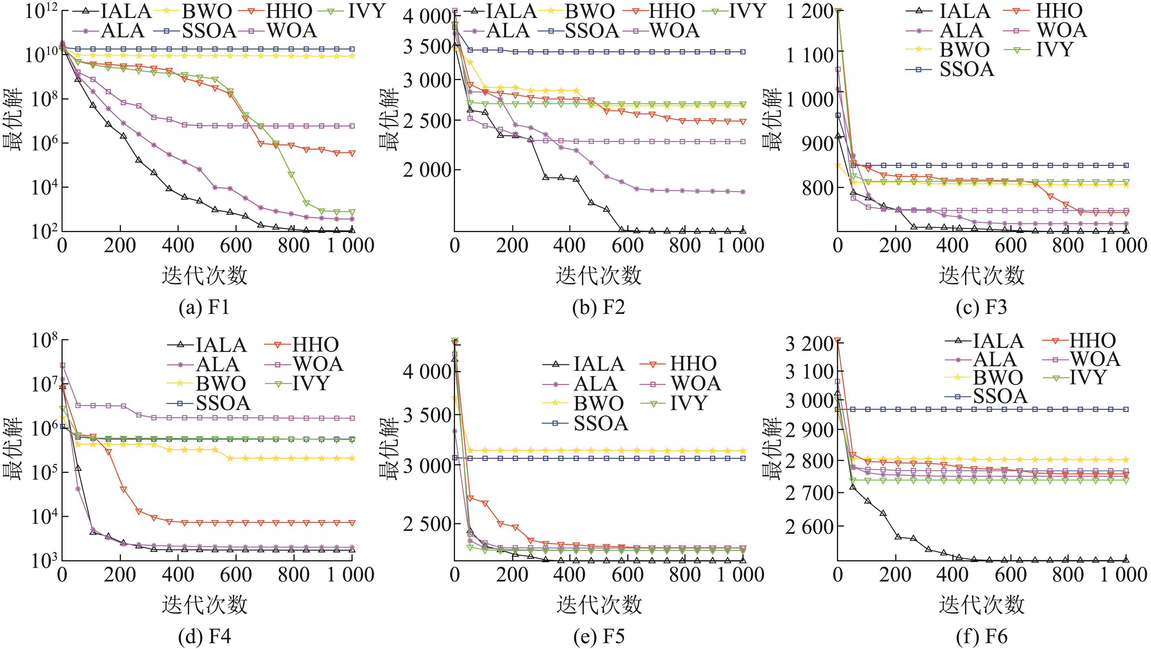 | F6 | 最优值 | 2.50×102 | 2.73×103 | 2.59×103 | 2.84×103 | 2.75×103 | 2.54×103 | 2.50×103 |